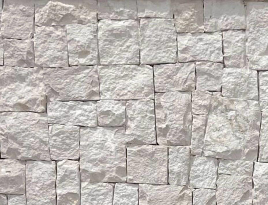 Piedra caliza cizallada en formato cuadrado, sonsiguiendo una superficie plana en todos sus lados. Al estar cuadrada facilita su colocación y permite crear una singular estética y elegancia. En su tonalidad el blanco predomina casi en su totalidad.
